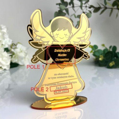 Podziękowanie komunijne powinno być nie tylko piękne, ale także symboliczne. Aniołek na komunię to ponadczasowy prezent, który wyraża wdzięczność oraz duchowy charakter tego wyjątkowego dnia. W zestawie znajduje się aniołek o wymiarach 15x11 cm, wykonany z lustrzanej pleksi, który dzięki personalizacji nabiera indywidualnego charakteru.