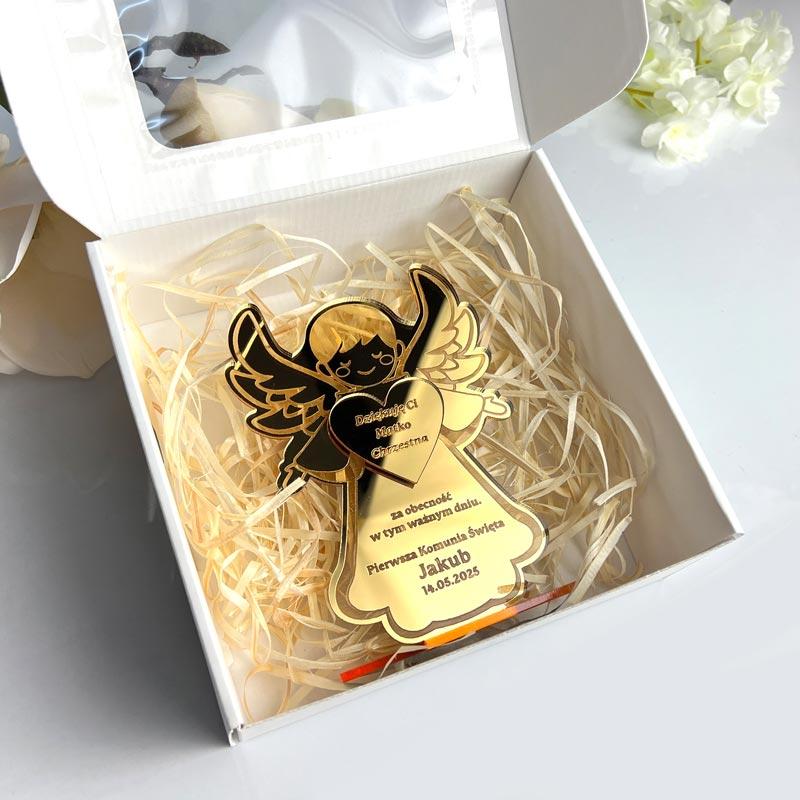 Aniołek komunijny – wyjątkowe podziękowanie na komunię dla Rodziców Chrzestnych Babci i Dziadka w zestawie w białym kartoniku z okienkiem