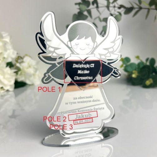 Podziękowanie komunijne powinno być nie tylko piękne, ale także symboliczne. Aniołek na komunię to ponadczasowy prezent, który wyraża wdzięczność oraz duchowy charakter tego wyjątkowego dnia. W zestawie znajduje się aniołek o wymiarach 15x11 cm, wykonany z lustrzanej pleksi, który dzięki personalizacji nabiera indywidualnego charakteru.