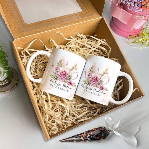 Eleganckie pudełko z okienkiem i naturalne wypełnienie – oryginalny upominek zestaw prezentowy kubki z nadrukiem dla babci i prababci