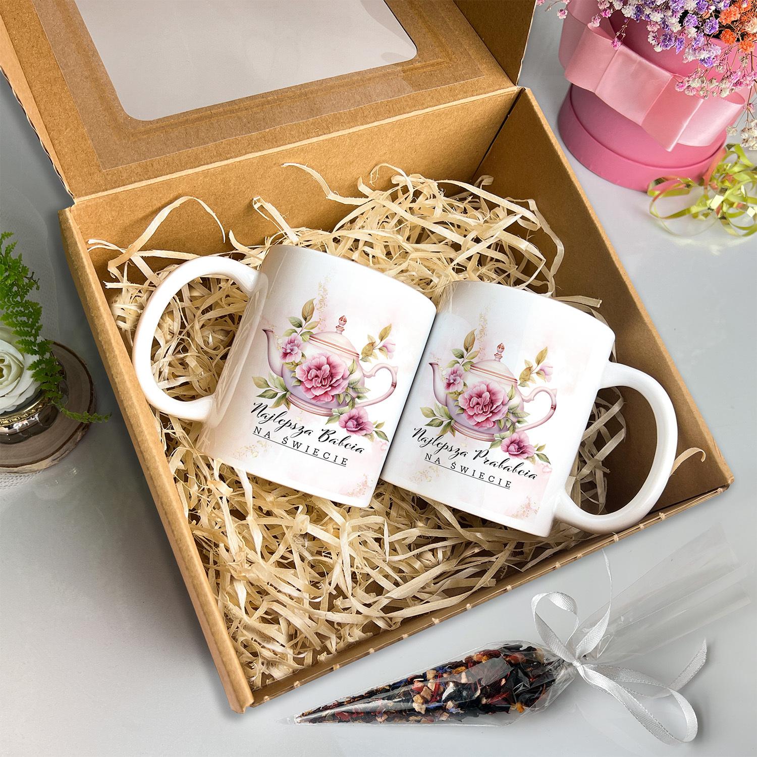Aromatyczna herbatka z kubkiem dla babci i prababci w eleganckim ozdobnym opakowaniu